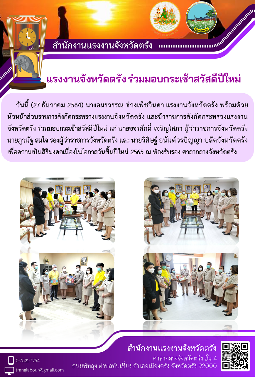 แรงงานจังหวัดตรัง พร้อมด้วย หัวหน้าส่วนราชการสังกัดกระทรวงแรงงานจังหวัดตรัง และข้าราชการสังกัดกระทรวงแรงงานจังหวัดตรัง ร่วมมอบกระเช้าสวัสดีปีใหม่