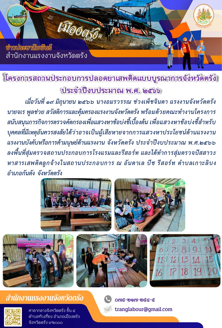 สรจ.ตรัง พร้อมด้วยคณะทำงานโครงการสนับสนุนภารกิจการตรวจคัดกรองเพื่อแสวงหาข้อบ่งชี้เบื้องต้น เพื่อแสวงหาข้อบ่งชี้สำหรับบุคคลที่มีเหตุอันควรสงสัยได้ว่าอาจเป็นผู้เสียหายจากการแสวงหาประโยชน์ด้านแรงงาน แรงงานบังคับหรือการค้ามนุษย์ด้านแรงงาน จังหวัดตรัง ประจำปีงบประมาณ พ.ศ.2566 ลงพื้นที่สุ่มตรวจปัสสาวะหาสารเสพติดลูกจ้างในสถานประกอบการ ณ อันดาเล บีช รีสอร์ท