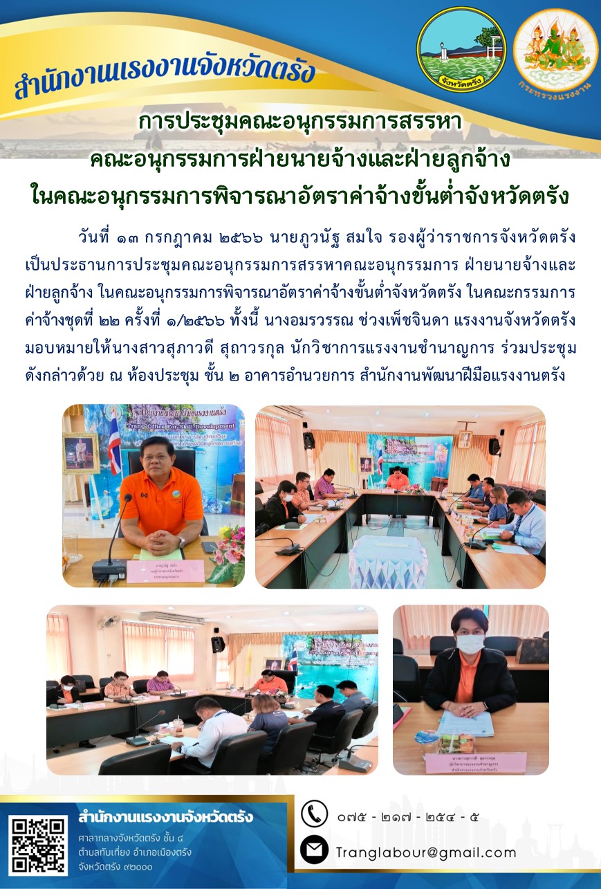 สรจ.ตรัง ร่วมการประชุมคณะอนุกรรมการสรรหาคณะอนุกรรมการฝ่ายนายจ้างและฝ่ายลูกจ้าง ในคณะอนุกรรมการพิจารณาอัตราค่าจ้างขั้นต่ำจังหวัดตรัง ในคณะกรรมการค่าจ้างชุดที่ 22 ครั้งที่ 1/2566