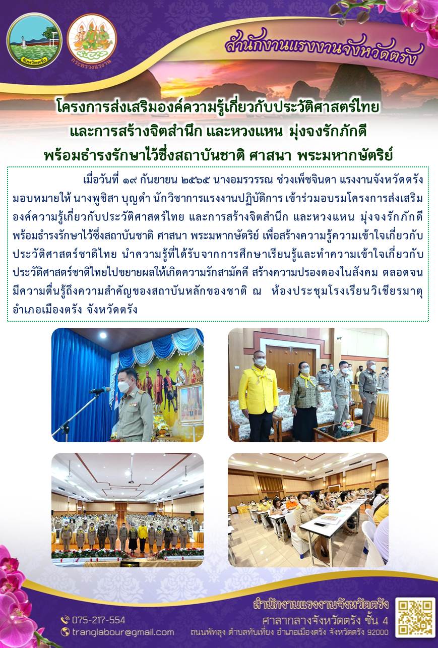 แรงงานจังหวัดตรัง มอบหมายให้ นางพูชิสา บุญดำ นักวิชาการแรงงานปฏิบัติการ เข้าร่วมอบรมโครงการส่งเสริมองค์ความรู้เกี่ยวกับประวัติศาสตร์ไทย และการสร้างจิตสำนึก และหวงแหน มุ่งจงรักภักดี พร้อมธำรงรักษาไว้ซึ่งสถาบันชาติ ศาสนา พระมหากษัตริย์