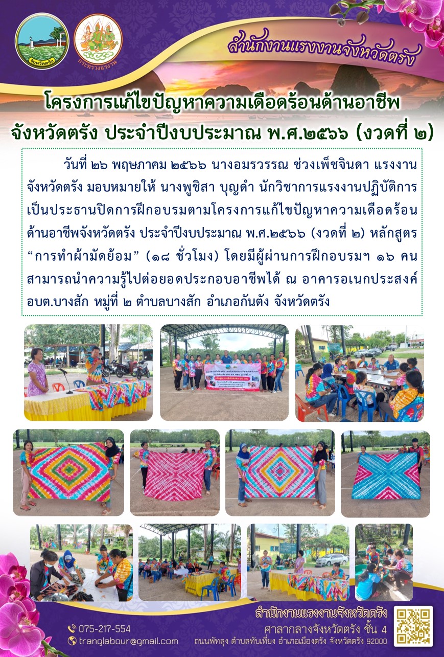 สรจ.ตรัง เป็นประธานปิดการฝึกอบรมตามโครงการแก้ไขปัญหาความเดือดร้อนด้านอาชีพจังหวัดตรัง ประจำปีงบประมาณ พ.ศ.2566 (งวดที่ 2) หลักสูตร “การทำผ้ามัดย้อม” (18 ชั่วโมง)
