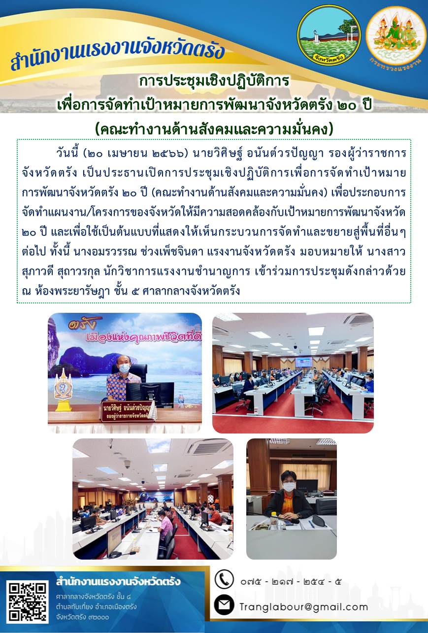 สรจ.ตรัง ร่วมการประชุมเชิงปฏิบัติการเพื่อการจัดทำเป้าหมายการพัฒนาจังหวัดตรัง 20 ปี (คณะทำงานด้านสังคมและความมั่นคง)