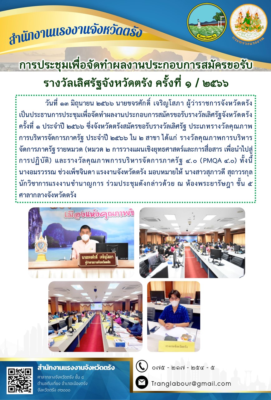 สรจ.ตรัง ร่วมการประชุมเพื่อจัดทำผลงานประกอบการสมัครขอรับรางวัลเลิศรัฐจังหวัดตรัง ครั้งที่ 1 /2566