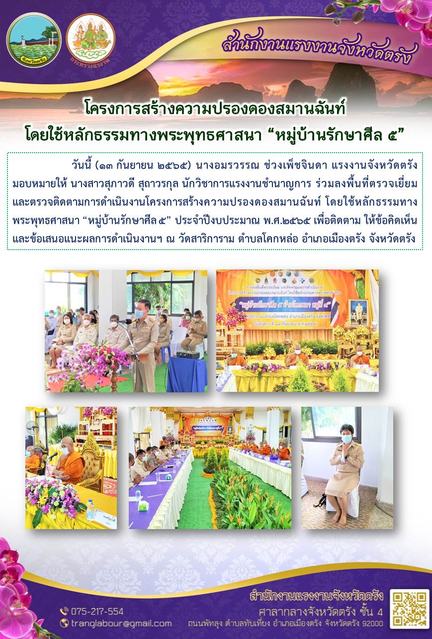 แรงงานจังหวัดตรัง มอบหมายให้ นางสาวสุภาวดี สุถาวรกุล นักวิชาการแรงงานชำนาญการ ร่วมโครงการสร้างความปรองดองสมานฉันท์ โดยใช้หลักธรรมทางพระพุทธศาสนา “หมู่บ้านรักษาศีล 5” ประจำปีงบประมาณ พ.ศ.2565