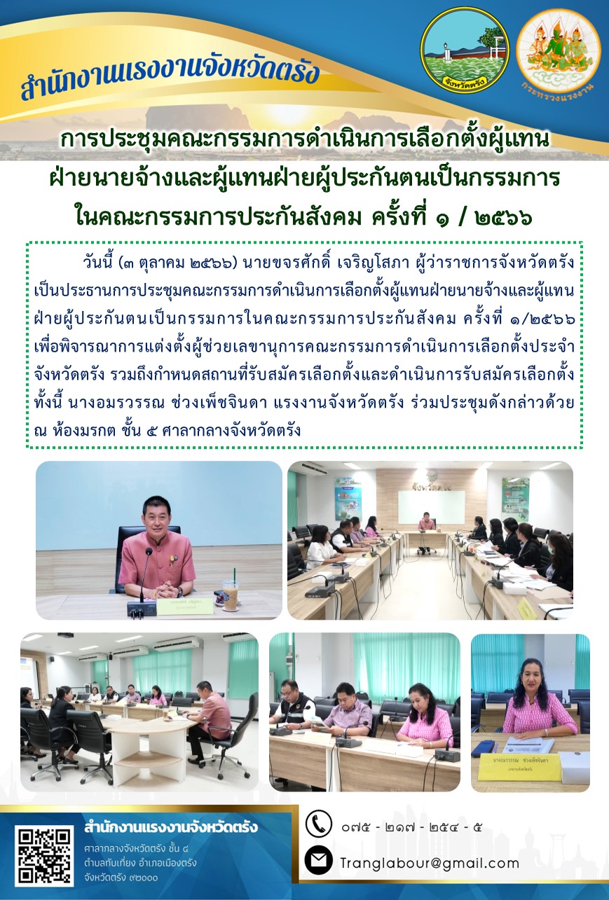 สรจ.ตรัง ร่วมการประชุมคณะกรรมการดำเนินการเลือกตั้งผู้แทนฝ่ายนายจ้างและผู้แทนฝ่ายผู้ประกันตนเป็นกรรมการในคณะกรรมการประกันสังคม ครั้งที่ 1/2566