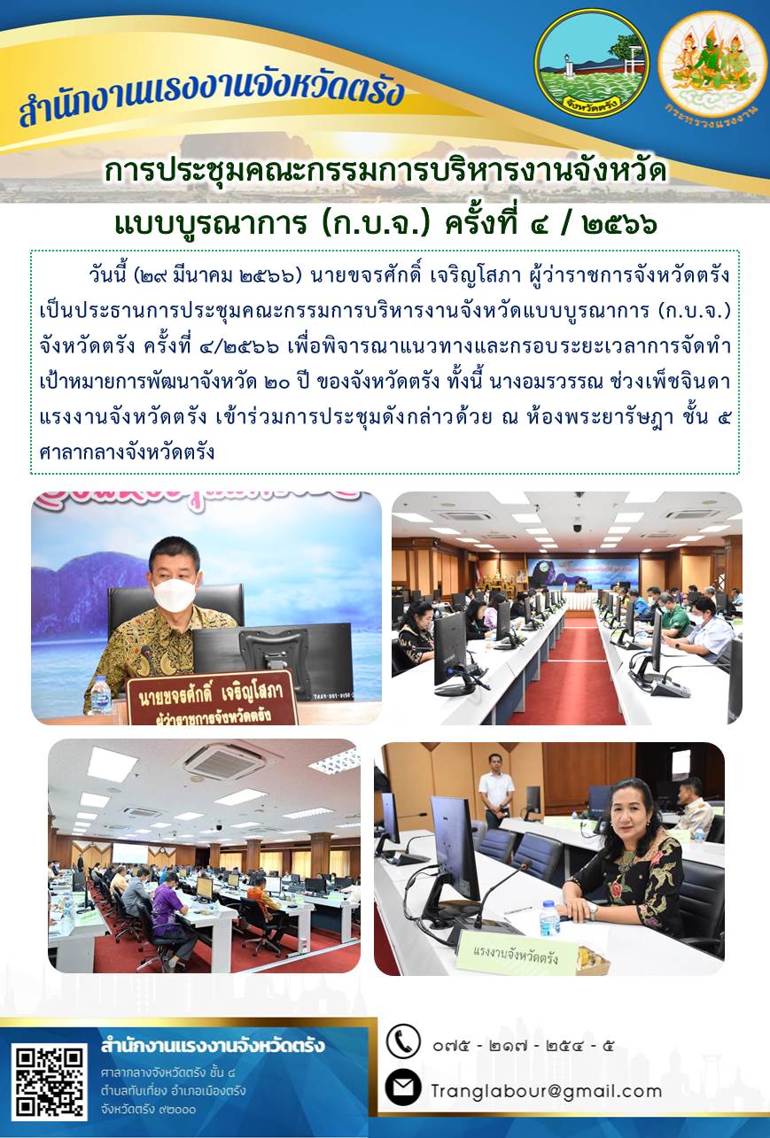 สรจ.ตรัง ร่วมการประชุมคณะกรรมการบริหารงานจังหวัดแบบบูรณาการ (ก.บ.จ.) จังหวัดตรัง ครั้งที่ 4/2566