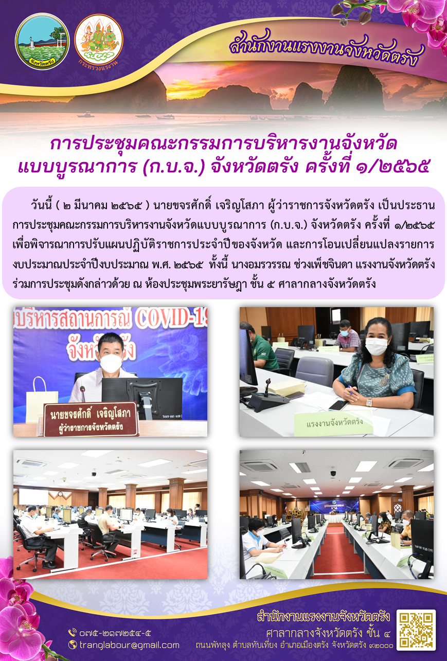 แรงงานจังหวัดตรัง ร่วมการประชุมคณะกรรมการบริหารงานจังหวัดแบบบูรณาการ (ก.บ.จ.) จังหวัดตรัง ครั้งที่ ๑/๒๕๖๕