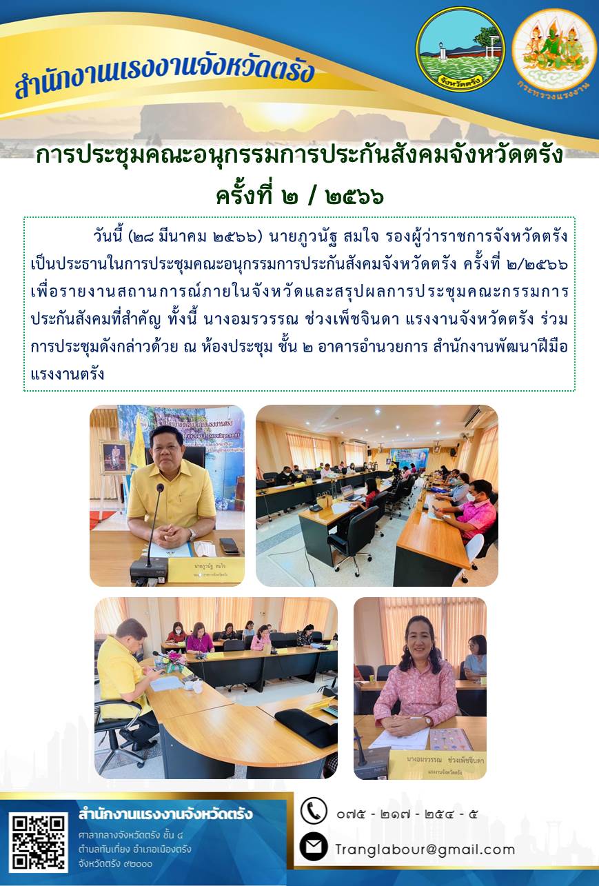 แรงงานจังหวัดตรัง ร่วมการประชุมคณะอนุกรรมการประกันสังคมจังหวัดตรัง ครั้งที่ 2/2566