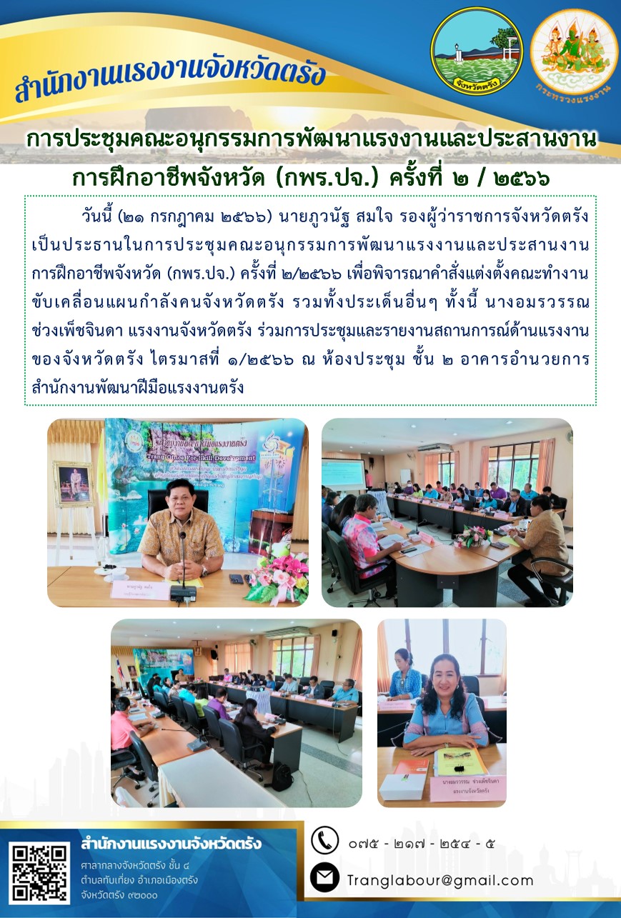 สรจ.ตรัง ร่วมการประชุมคณะอนุกรรมการพัฒนาแรงงานและประสานงานการฝึกอาชีพจังหวัด (กพร.ปจ.) ครั้งที่ 2/2566