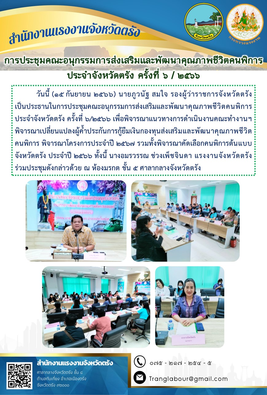 สรจ.ตรัง ร่วมการประชุมคณะอนุกรรมการส่งเสริมและพัฒนาคุณภาพชีวิตคนพิการประจำจังหวัดตรัง ครั้งที่ 6/2566