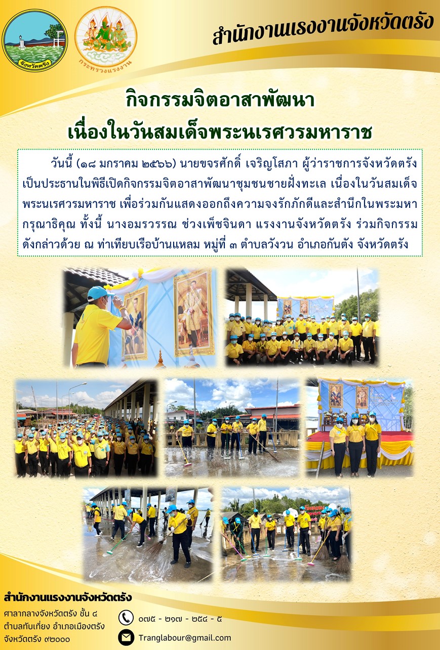 แรงงานจังหวัดตรัง ร่วมกิจกรรมจิตอาสาพัฒนา เนื่องในวันสมเด็จพระนเรศวรมหาราช