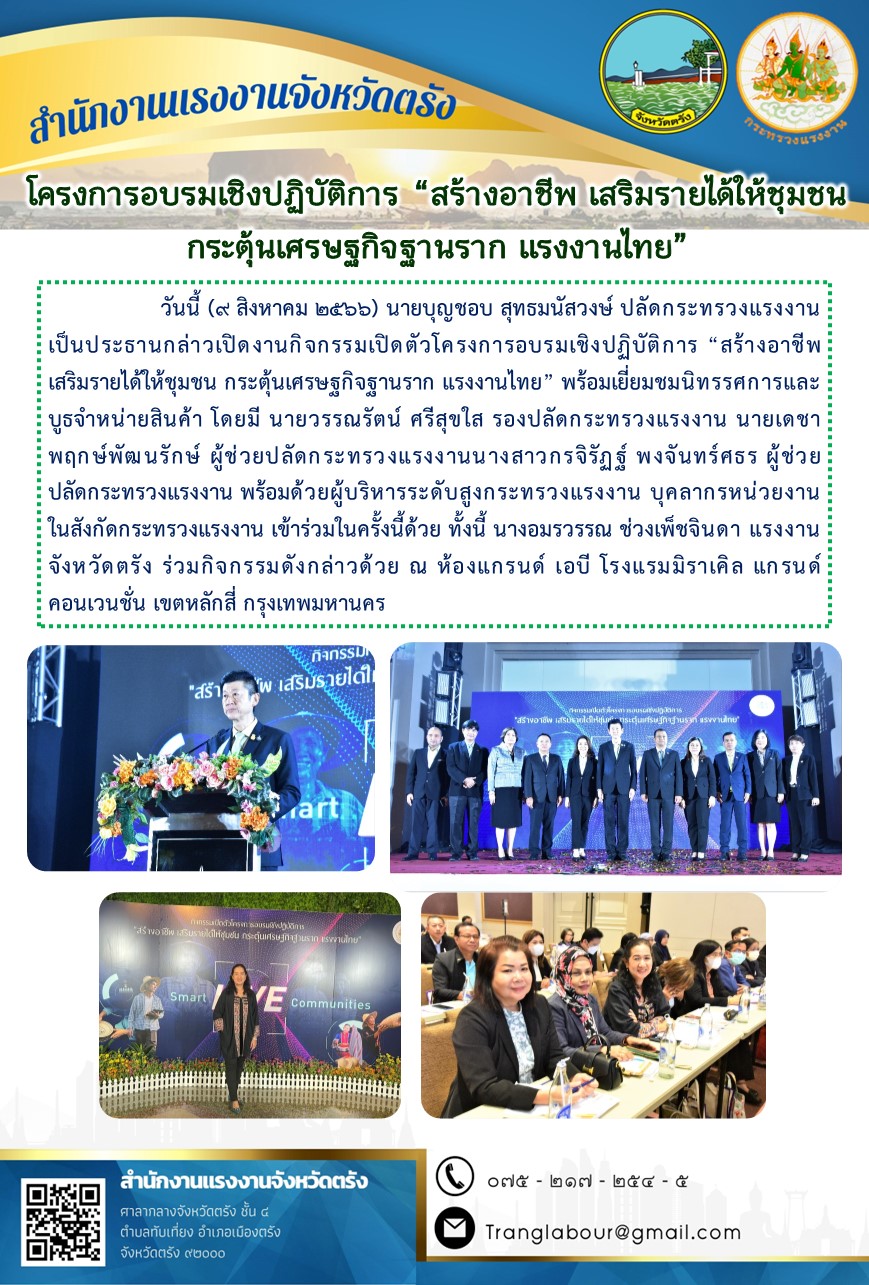 สรจ.ตรัง ร่วมกิจกรรมเปิดตัวโครงการอบรมเชิงปฏิบัติการ “สร้างอาชีพ เสริมรายได้ให้ชุมชน กระตุ้นเศรษฐกิจฐานราก แรงงานไทย”