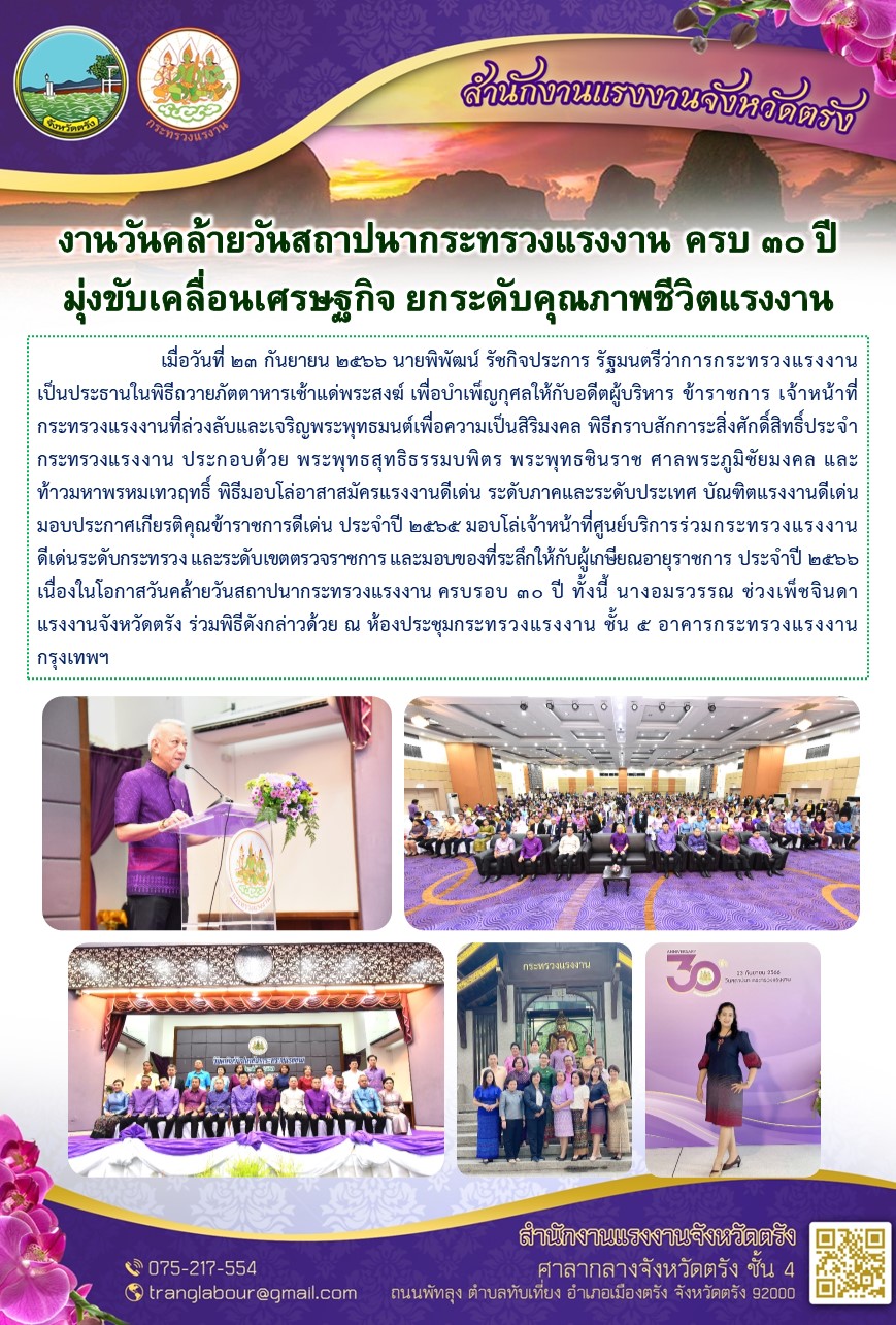 สรจ.ตรัง ร่วมงานวันคล้ายวันสถาปนากระทรวงแรงงาน ครบ 30 ปี มุ่งขับเคลื่อนเศรษฐกิจ ยกระดับคุณภาพชีวิตแรงงาน