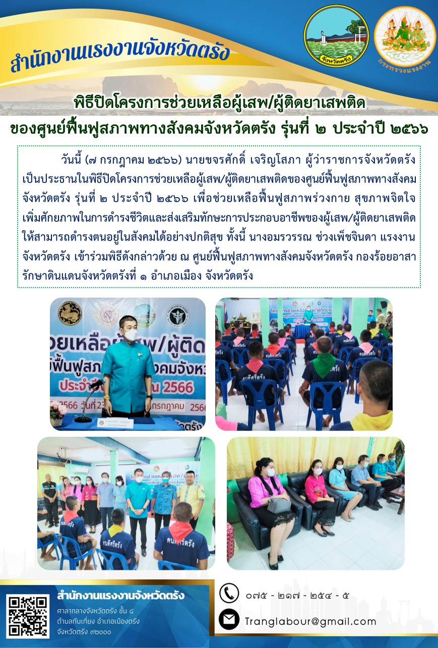 สรจ.ตรัง ร่วมพิธีปิดโครงการช่วยเหลือผู้เสพ/ผู้ติดยาเสพติดของศูนย์ฟื้นฟูสภาพทางสังคมจังหวัดตรัง รุ่นที่ 2 ประจำปี 2566