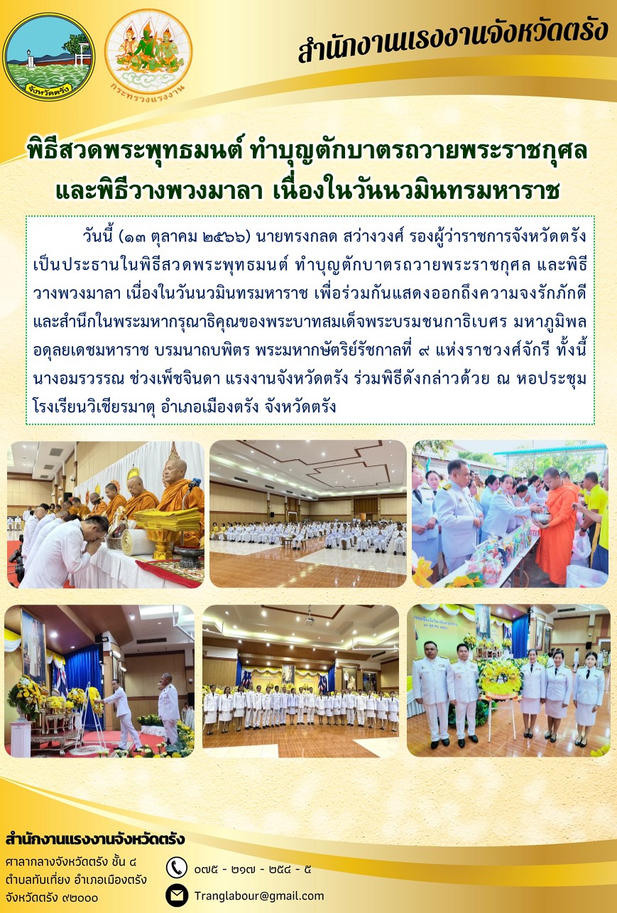 สรจ.ตรัง ร่วมพิธีสวดพระพุทธมนต์ ทำบุญตักบาตรถวายพระราชกุศล และพิธีวางพวงมาลา เนื่องในวันนวมินทรมหาราช