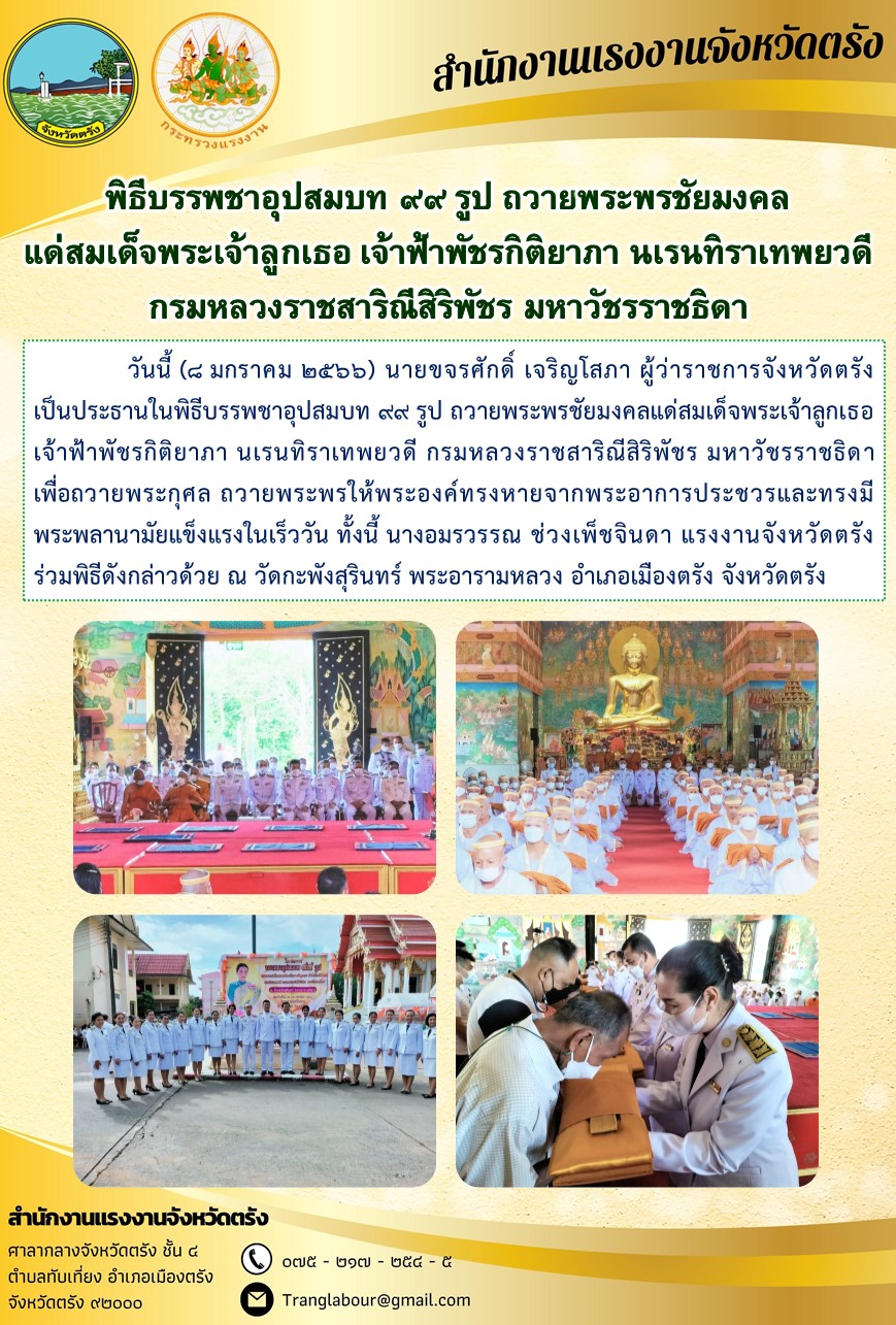 แรงงานจังหวัดตรัง ร่วมพิธีเจริญพระพุทธมนต์เฉลิมพระเกียรติสมเด็จพระเจ้าลูกเธอ เจ้าฟ้าสิริวัณณวรี นารีรัตนราชกัญญา เนื่องในโอกาสวันคล้ายวันประสูติ