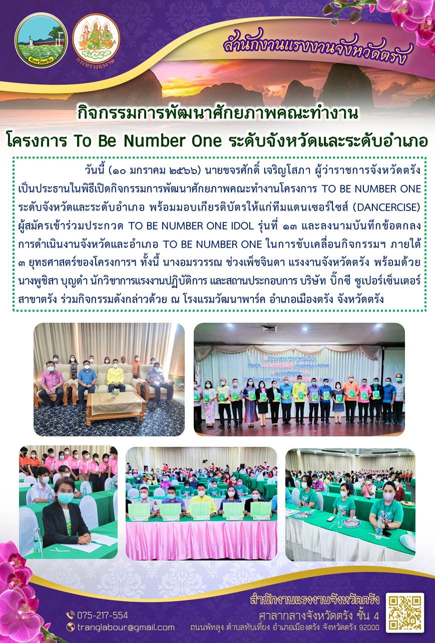 แรงงานจังหวัดตรัง ร่วมพิธีเปิดกิจกรรมการพัฒนาศักยภาพคณะทำงานโครงการ TO BE NUMBER ONE ระดับจังหวัดและระดับอำเภอ