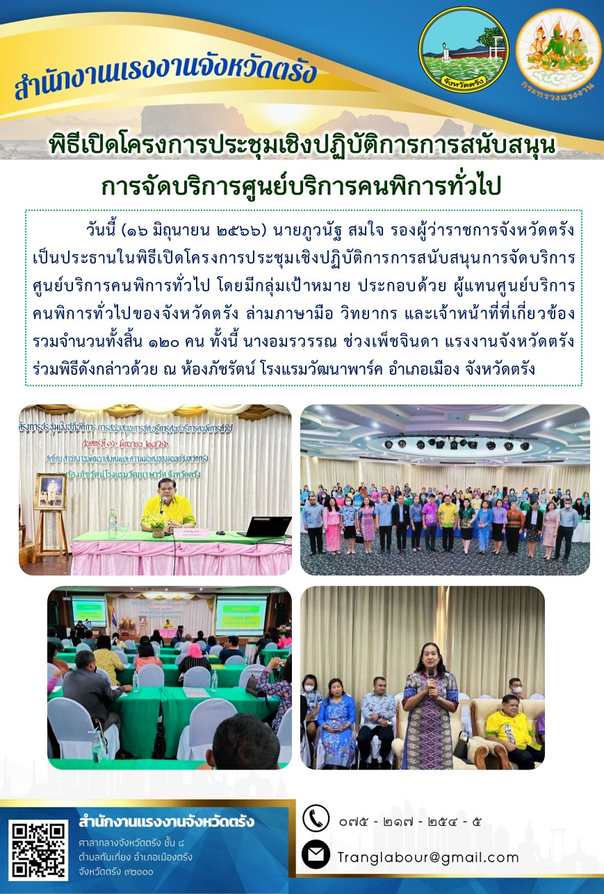 สรจ.ตรัง ร่วมพิธีเปิดโครงการประชุมเชิงปฏิบัติการการสนับสนุนการจัดบริการศูนย์บริการคนพิการทั่วไป