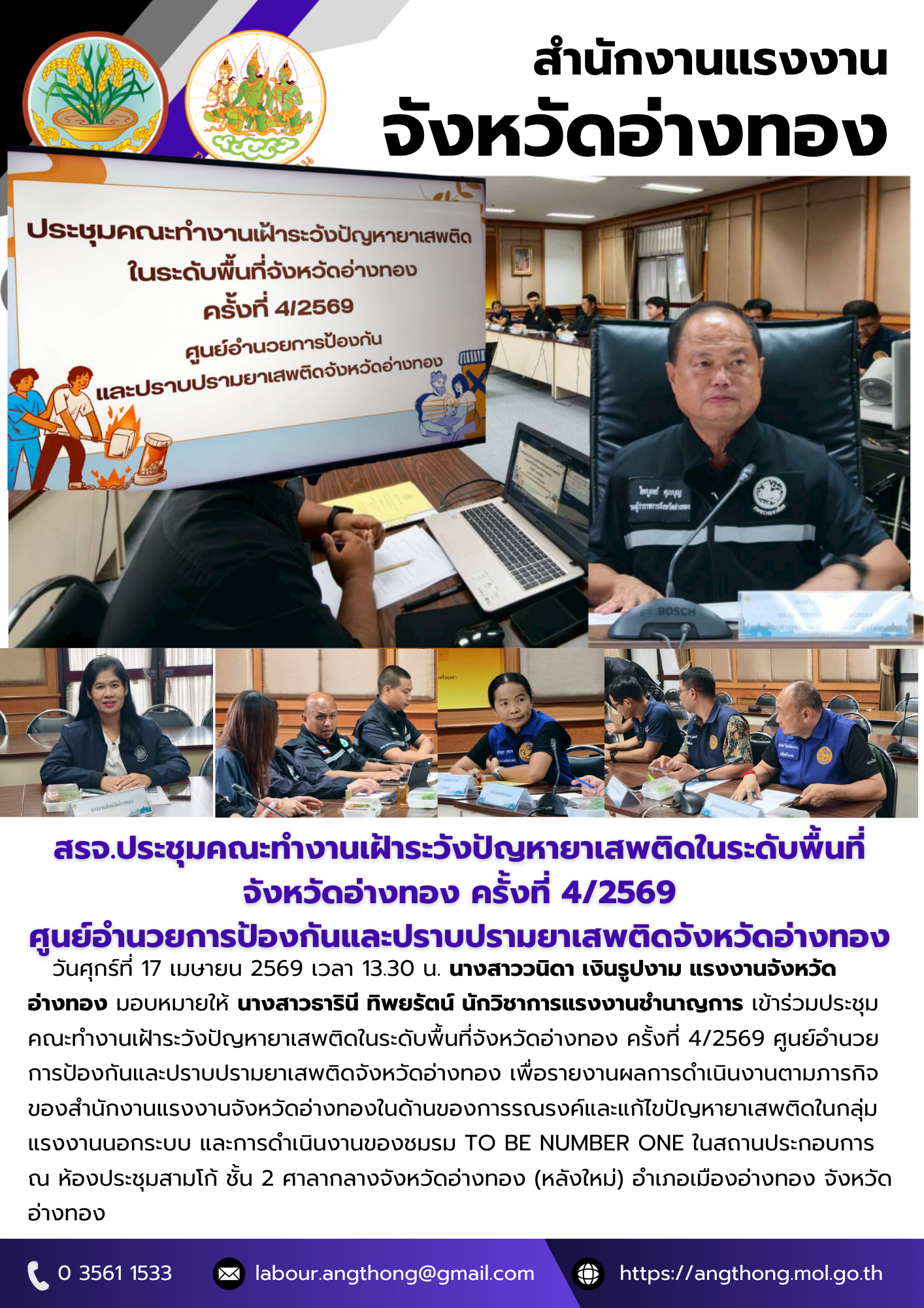สรจ.อ่างทองประชุมติดตามผลการดำเนินงานการประสานการ ให้บริการด้านแรงงานในพื้นที่ของอาสาสมัครแรงงานและเครือข่ายจังหวัดอ่างทอง ประจำปีงบประมาณ พ.ศ. 2569 รอบ 6 เดือนแรก