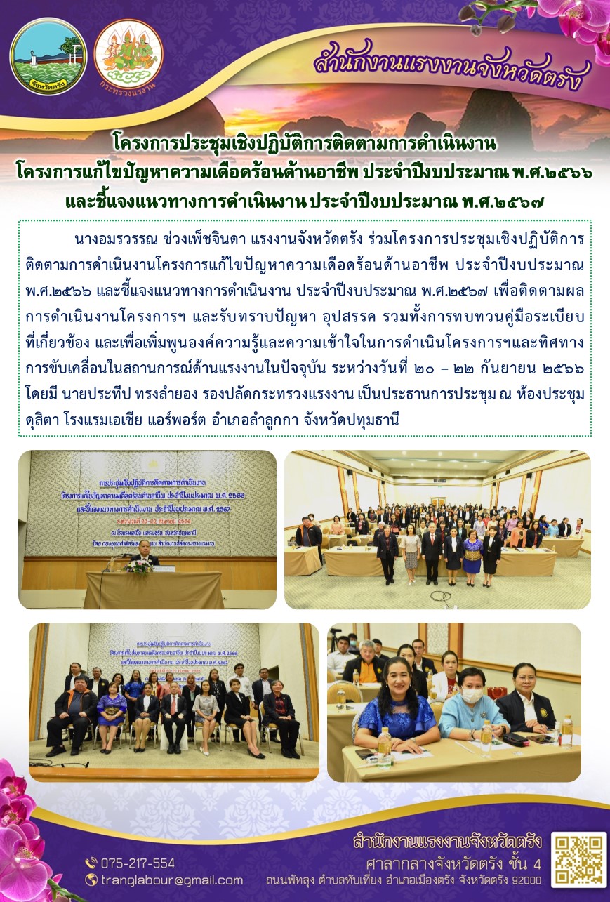 สรจ.ตรัง ร่วมโครงการประชุมเชิงปฏิบัติการติดตามการดำเนินงานโครงการแก้ไขปัญหาความเดือดร้อนด้านอาชีพ ประจำปีงบประมาณ พ.ศ.2566 และชี้แจงแนวทางการดำเนินงาน ประจำปีงบประมาณ พ.ศ.2567