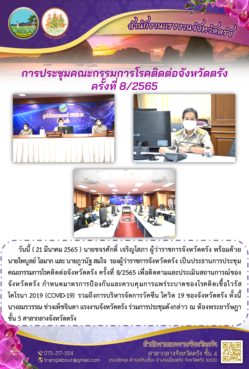 แรงงานจังหวัดตรัง ร่วมการประชุมคณะกรรมการโรคติดต่อจังหวัดตรัง ครั้งที่ 8/2565
