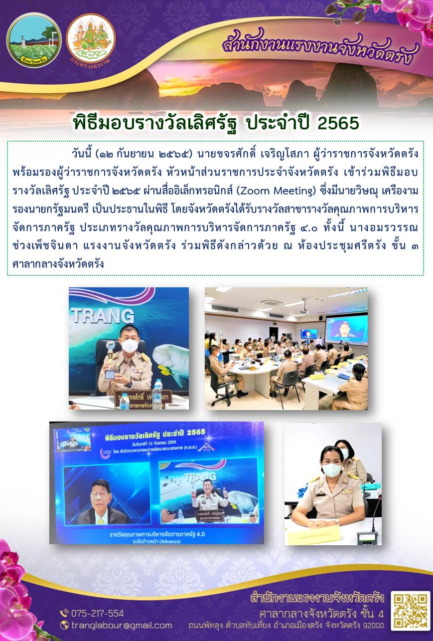 แรงงานจังหวัดตรัง เข้าร่วมพิธีมอบรางวัลเลิศรัฐ ประจำปี 2565