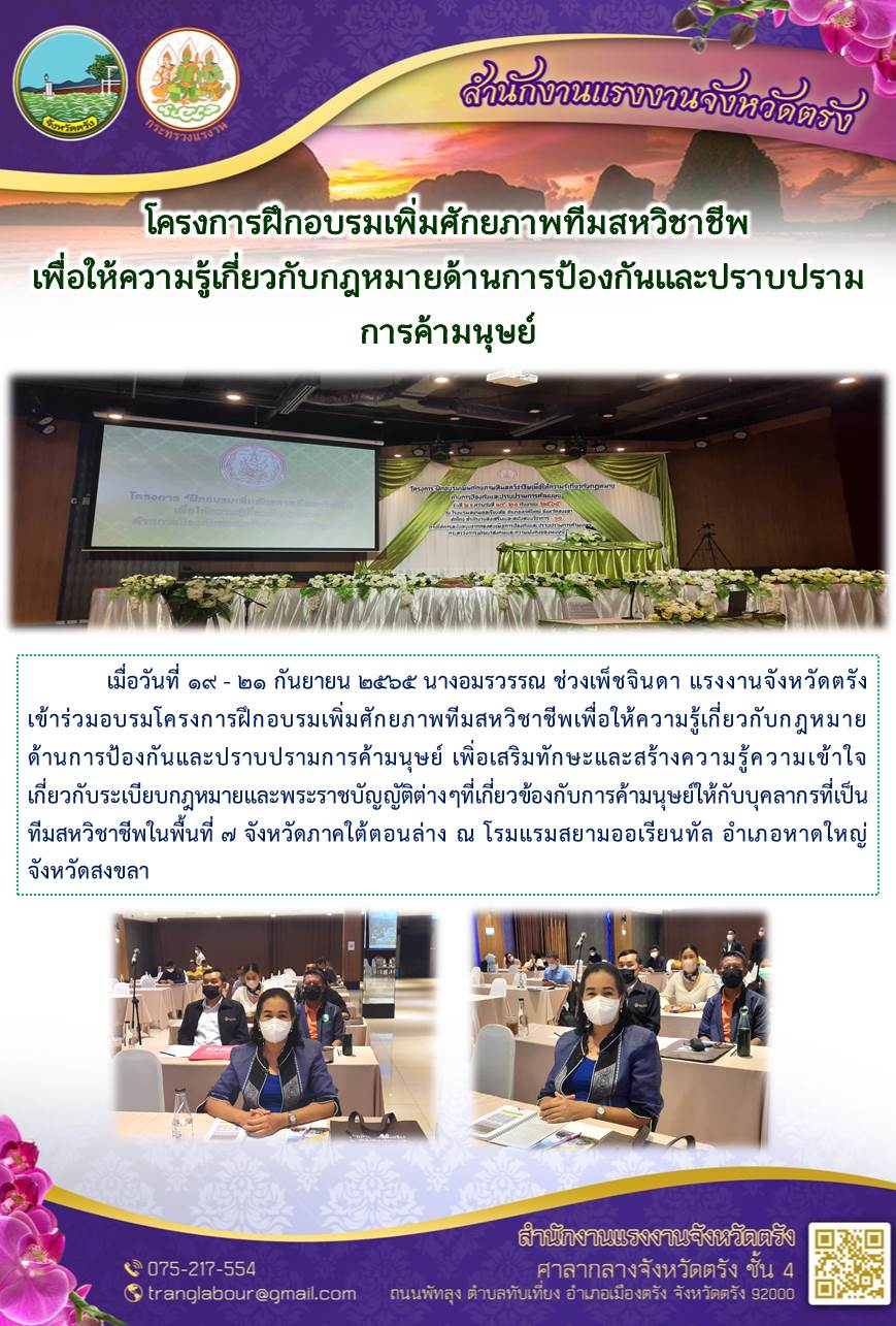 แรงงานจังหวัดตรัง เข้าร่วมอบรมโครงการฝึกอบรมเพิ่มศักยภาพทีมสหวิชาชีพเพื่อให้ความรู้เกี่ยวกับกฎหมายด้านการป้องกันและปราบปรามการค้ามนุษย์