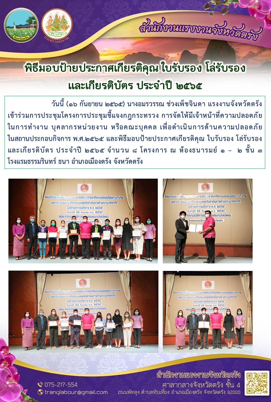 แรงงานจังหวัดตรัง เข้าร่วมโครงการประชุมชี้แจงกฎกระทรวง การจัดให้มีเจ้าหน้าที่ความปลอดภัยในการทำงาน บุคลากรหน่วยงาน หรือคณะบุคคล เพื่อดำเนินการด้านความปลอดภัยในสถานประกอบกิจการ พ.ศ. 2565 และพิธีมอบป้ายประกาศเกียรติคุณ ใบรับรอง โล่รางวัล และเกียรติบัตร ประจำปี 2565
