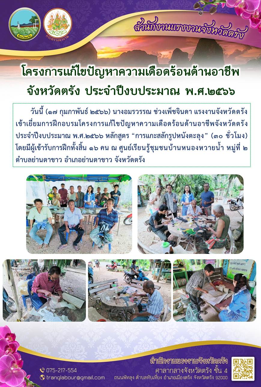 แรงงานจังหวัดตรัง เข้าเยี่ยมการฝึกอบรมโครงการแก้ไขปัญหาความเดือดร้อนด้านอาชีพจังหวัดตรัง ประจำปีงบประมาณ พ.ศ.2566 หลักสูตร “การแกะสลักรูปหนังตะลุง” (30 ชั่วโมง)