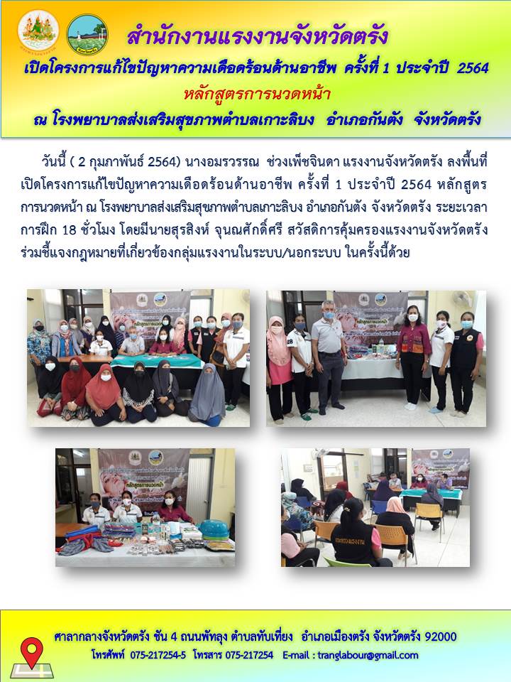 แรงงานจังหวัดตรัง เปิดโครงการแก้ไขปัญหาความเดือดร้อนด้านอาชีพ ครั้งที่ 1 ประจำปี 2564 หลักสูตรการนวดหน้า ณ โรงพยาบาลส่งเสริมสุขภาพตำบลเกาะลิบง อำเภอกันตัง จังหวัดตรัง