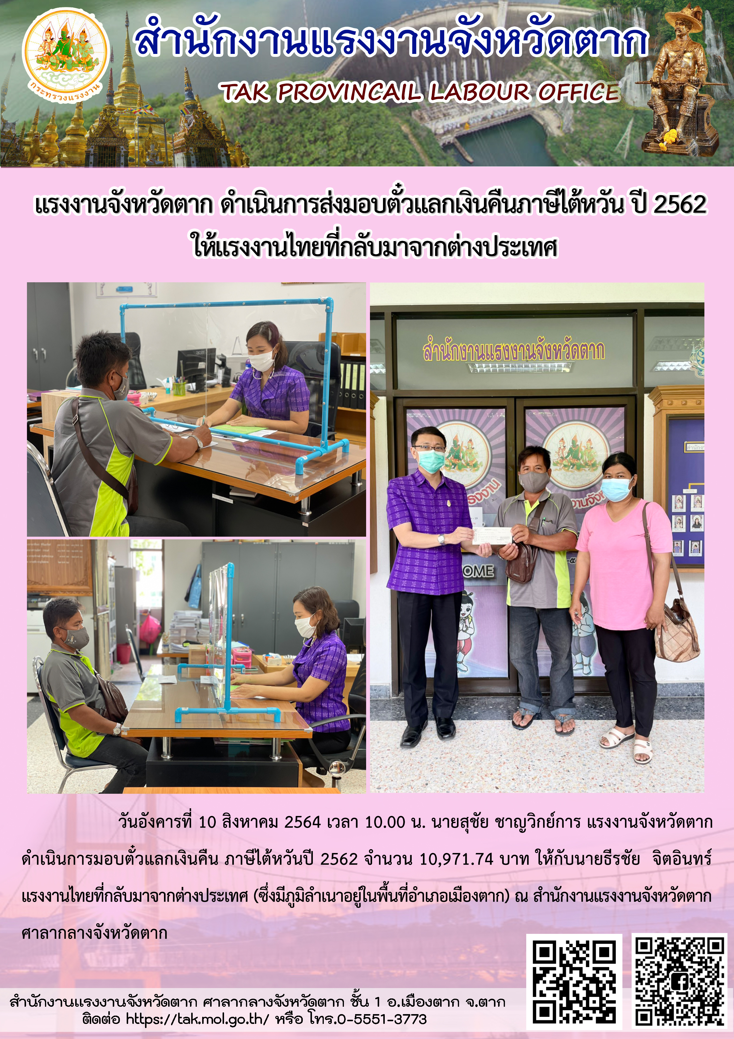 แรงงานจังหวัดตาก ดำเนินการส่งมอบตั๋วแลกเงินคืนภาษีไต้หวัน ปี 2562 ให้แรงงานไทยที่กลับมาจากต่างประเทศ
