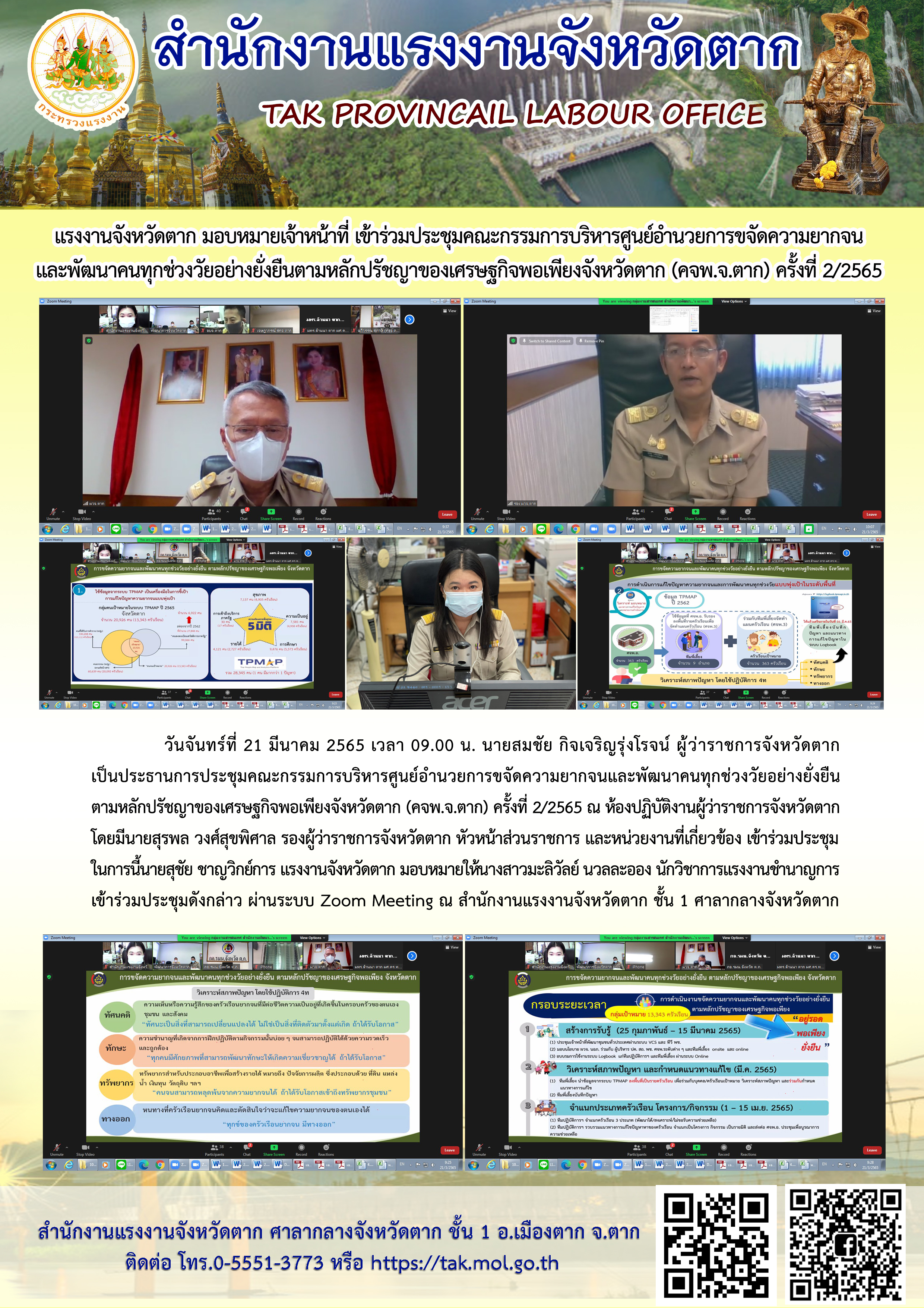แรงงานจังหวัดตาก มอบหมายเจ้าหน้าที่ เข้าร่วมประชุมคณะกรรมการบริหารศูนย์อำนวยการขจัดความยากจนและพัฒนาคนทุกช่วงวัยอย่างยั่งยืนตามหลักปรัชญาของเศรษฐกิจพอเพียงจังหวัดตาก (คจพ.จ.ตาก) ครั้งที่ 2/2565