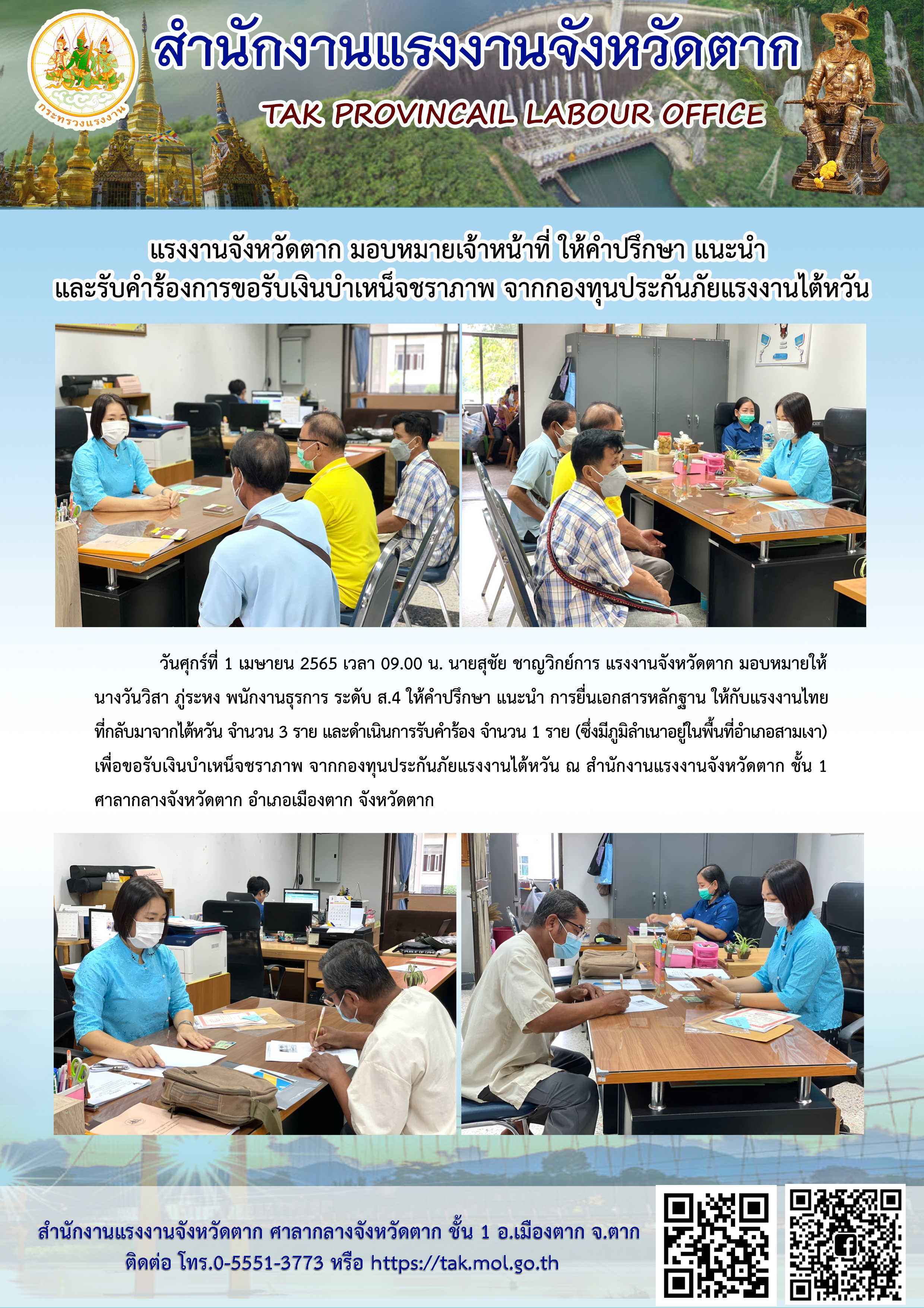 แรงงานจังหวัดตาก มอบหมายเจ้าหน้าที่ ให้คำปรึกษา แนะนำ และรับคำร้องการขอรับเงินบำเหน็จชราภาพ จากกองทุนประกันภัยแรงงานไต้หวัน