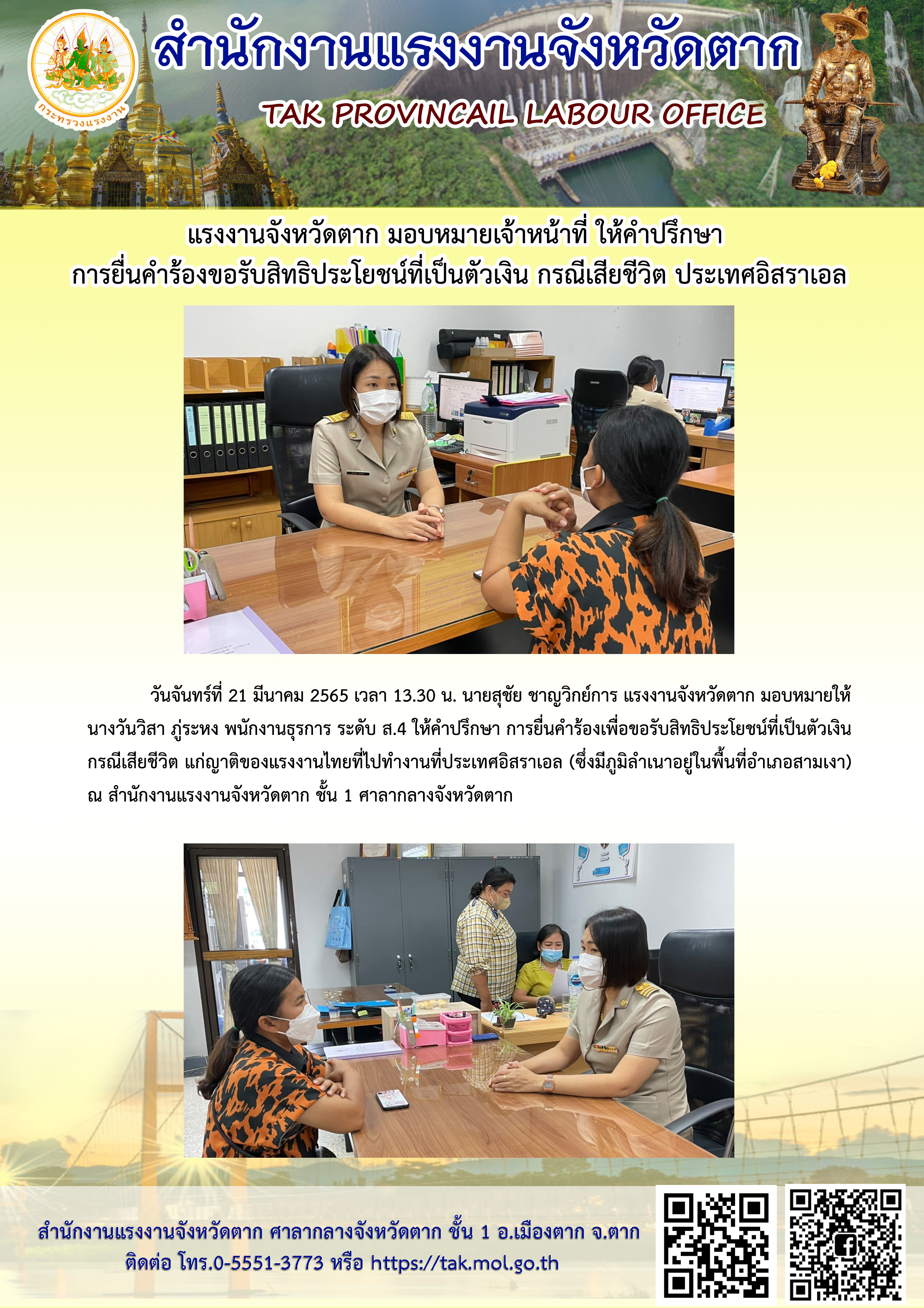 แรงงานจังหวัดตาก มอบหมายเจ้าหน้าที่ ให้คำปรึกษา การยื่นคำร้องขอรับสิทธิประโยชน์ที่เป็นตัวเงิน กรณีเสียชีวิต ประเทศอิสราเอล