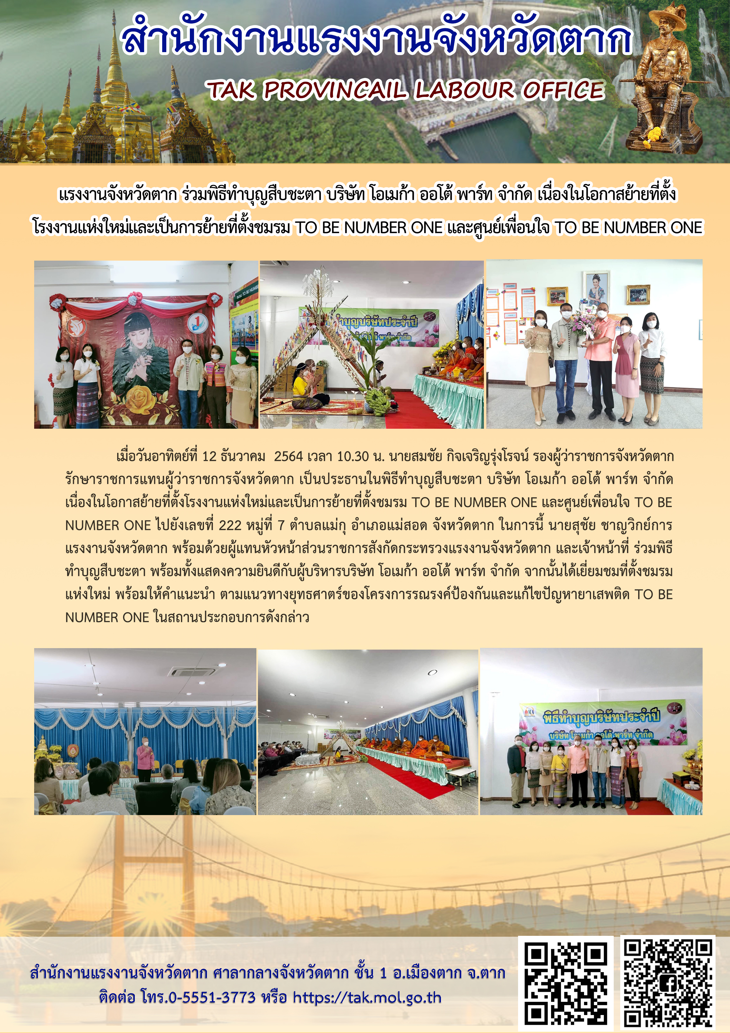 แรงงานจังหวัดตาก ร่วมพิธีทำบุญสืบชะตา บริษัท โอเมก้า ออโต้ พาร์ท จำกัด เนื่องในโอกาสย้ายที่ตั้งโรงงานแห่งใหม่ และเป็นการย้ายที่ตั้งชมรมTO BE NUMBER ONE และศูนย์เพื่อนใจ TO BE NUMBER ONE