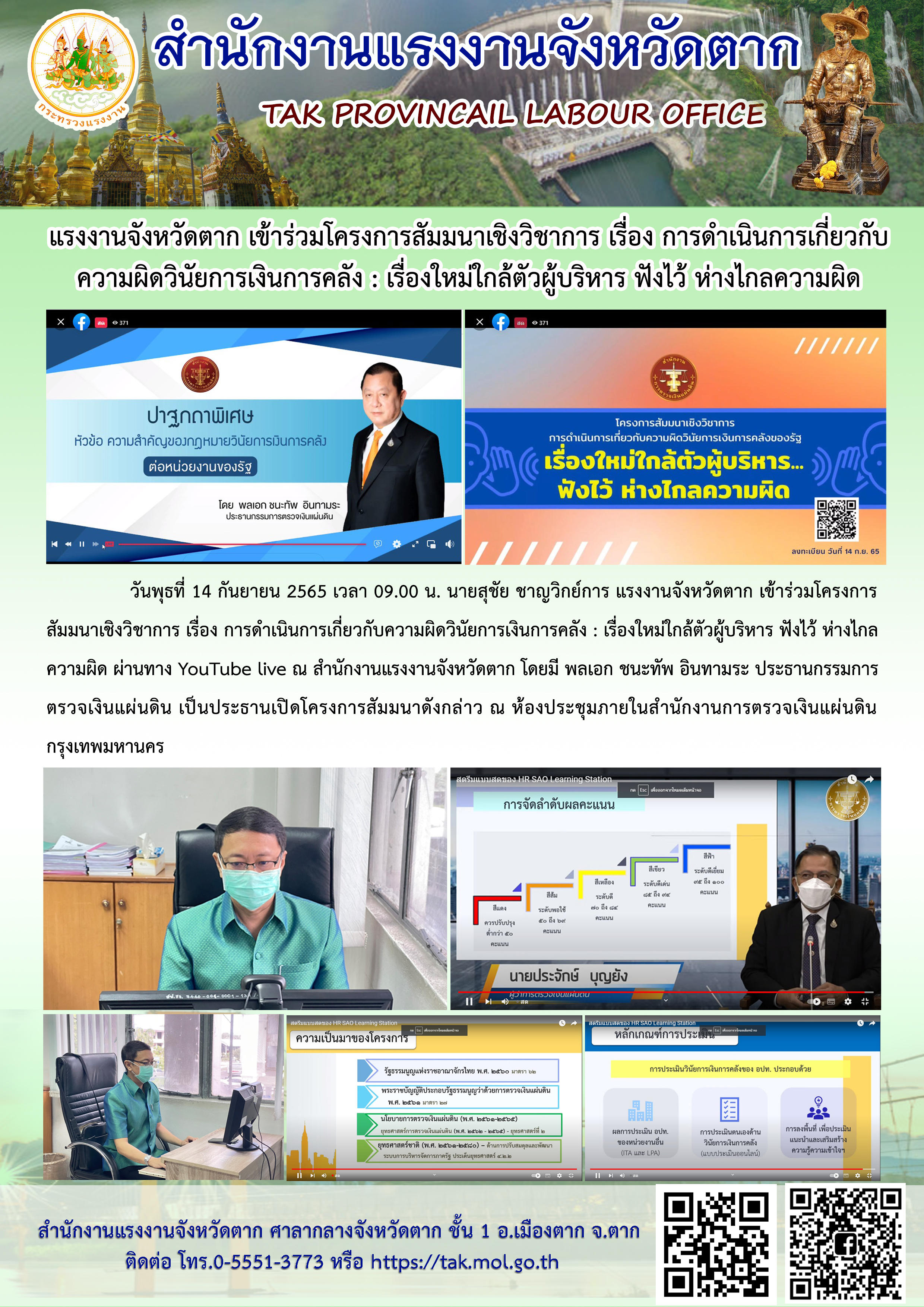 แรงงานจังหวัดตาก เข้าร่วมโครงการสัมมนาเชิงวิชาการ เรื่อง การดำเนินการเกี่ยวกับความผิดวินัยการเงินการคลัง : เรื่องใหม่ใกล้ตัวผู้บริหาร ฟังไว้ ห่างไกลความผิด