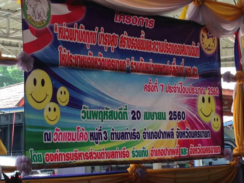 เมื่อวันที่ 20 เมษายน 2560 นางอำนวย คมแก้ว แรงงานจังหวัดนครนายก ร่วมออกให้บริการประชาชนร่วมกับจังหวัดนครนายก ในโครงการบำบัดทุกข์ บำรุงสุข สร้างรอยยิ้มและความปรองดองสมานฉันท์ให้ประชาชน ณ วัดแขมโค้ง ตำบลปากพลี อำเภอปากพลี จังหวัดนครนายก