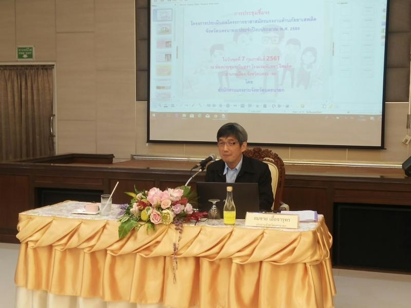 เมื่อวันที่ 7 กุมภาพันธ์ 2561 นายสมชาย เอื้อจารุพร แรงงานจังหวัดนครนายก ได้จัดประชุมชี้แจงโครงการประเมินผลโครงการอาสาสมัครแรงงานต้านภัยยาเสพติด ประจำปีงบประมาณ พ.ศ.2560 ณ ห้องประชุมราวินทรา โรงแรมจันทรา รีสอร์ท อำเภอเมือง จังหวัดนครนายก