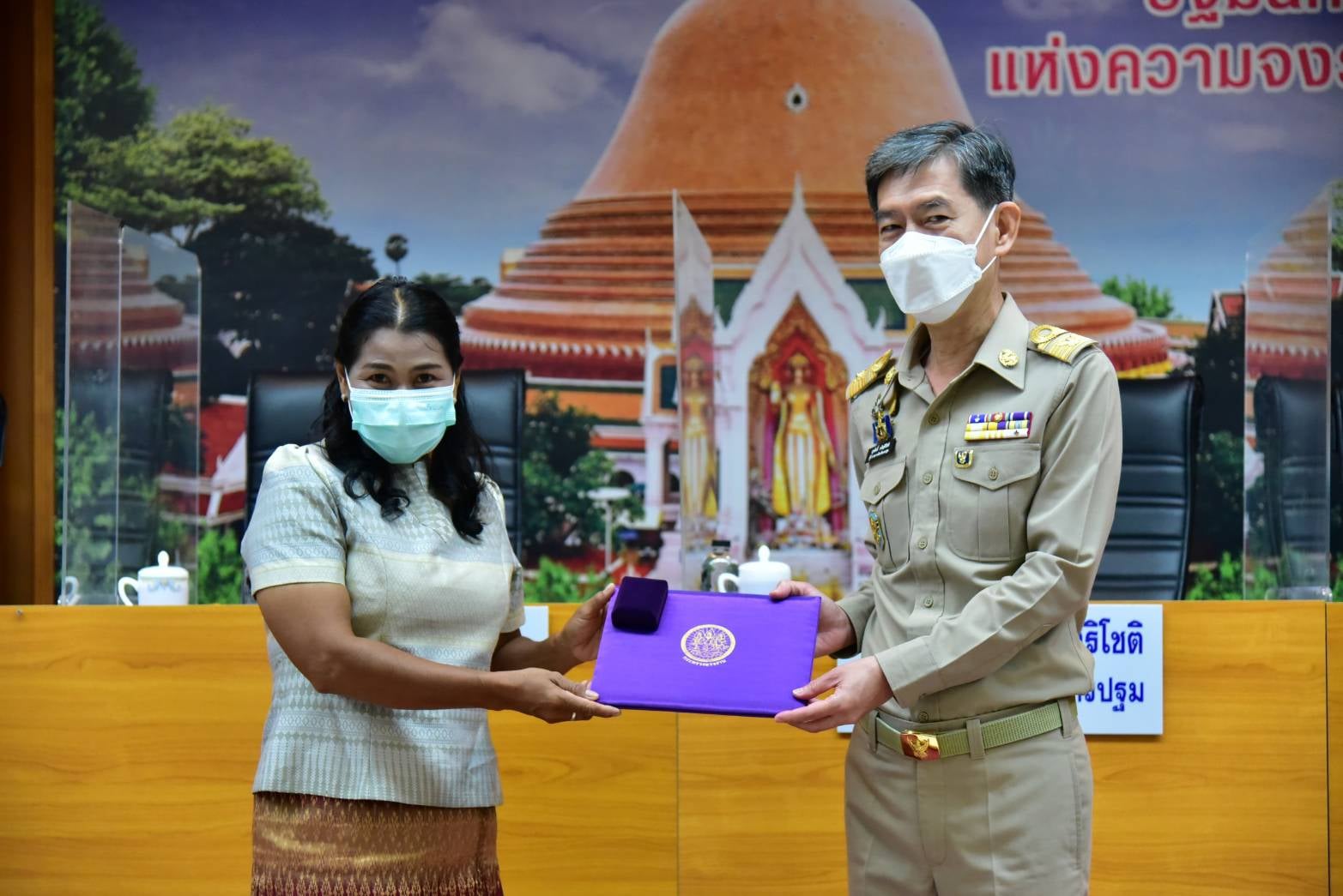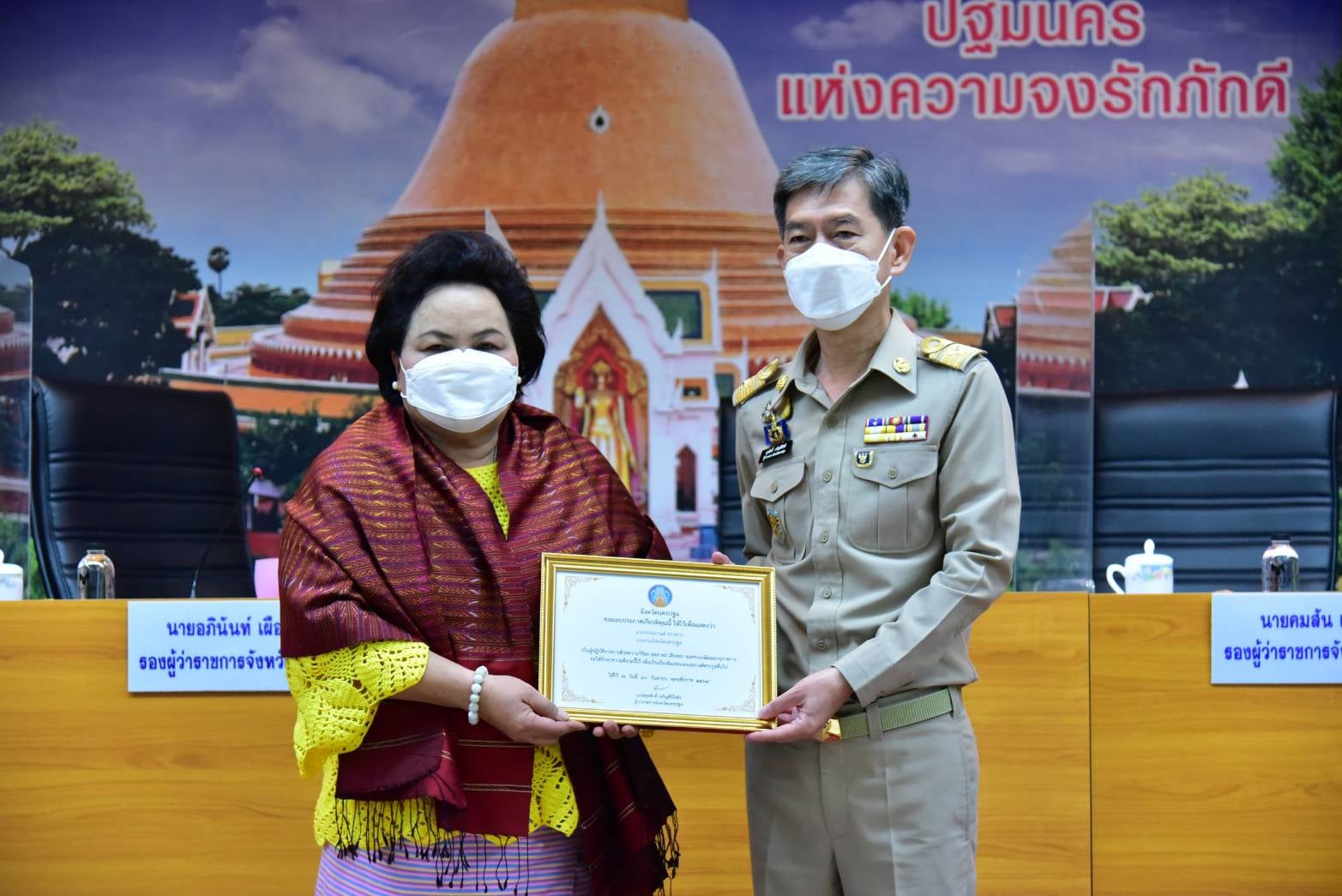 ในการนี้ นายสุรศักดิ์ เจริญศิริโชติ ผู้ว่าราชการจังหวัดนครปฐม ได้เป็นประธานในพิธีมอบโล่ “เพชรน้ำหนึ่งของชาวนครปฐม” ให้แก่ นางวรรณกานต์ ขาวลาภ แรงงานจังหวัดนครปฐม ที่มีผลงานยอดเยี่ยมด้านการดำเนินงานป้องกันและแก้ไขปัญหาโรคติดเชื้อไวรัสโคโรนา 2019 และมอบโล่ประกาศเกียรติคุณแก่หัวหน้าส่วนราชการในจังหวัดนครปฐมที่เกษียณอายุราชการประจำปี พ.ศ. 2564