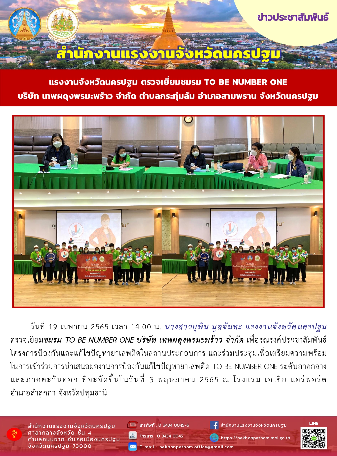 แรงงานจังหวัดนครปฐม ตรวจเยี่ยมชมรม TO BE NUMBER ONE บริษัท เทพผดุงพรมะพร้าว จํากัด ตำบลกระทุ่มล้ม อำเภอสามพราน จังหวัดนครปฐม