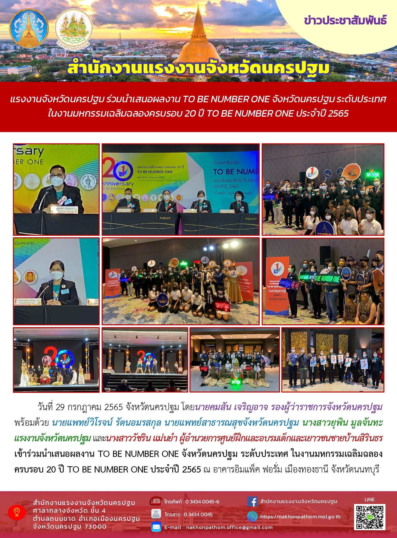 แรงงานจังหวัดนครปฐม ร่วมนำเสนอผลงาน TO BE NUMBER ONE จังหวัดนครปฐม ระดับประเทศ ในงานมหกรรมเฉลิมฉลองครบรอบ 20 ปี TO BE NUMBER ONE ประจำปี 2565