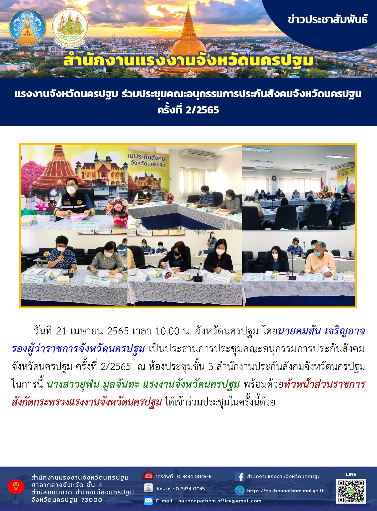 แรงงานจังหวัดนครปฐม ร่วมประชุมคณะอนุกรรมการประกันสังคมจังหวัดนครปฐม ครั้งที่ 2/2565