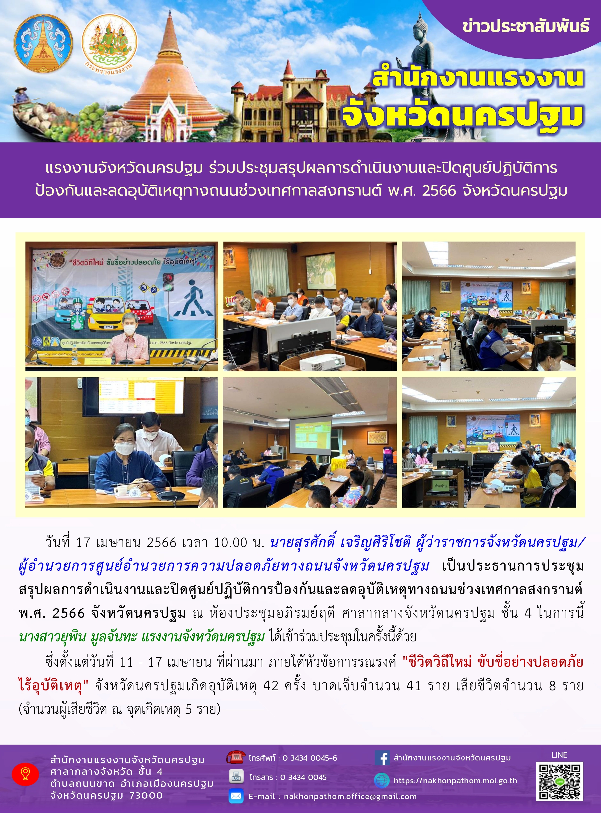 สรจ.นครปฐม ร่วมประชุมสรุปผลการดำเนินงานและปิดศูนย์ปฏิบัติการป้องกันและลดอุบัติเหตุทางถนนช่วงเทศกาลสงกรานต์ พ.ศ. 2566