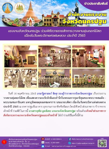 แรงงานจังหวัดนครปฐม ร่วมพิธีถวายราชสักการะวางพานพุ่มดอกไม้สด เนื่องในวันพระบิดาแห่งฝนหลวง ประจำปี 2565