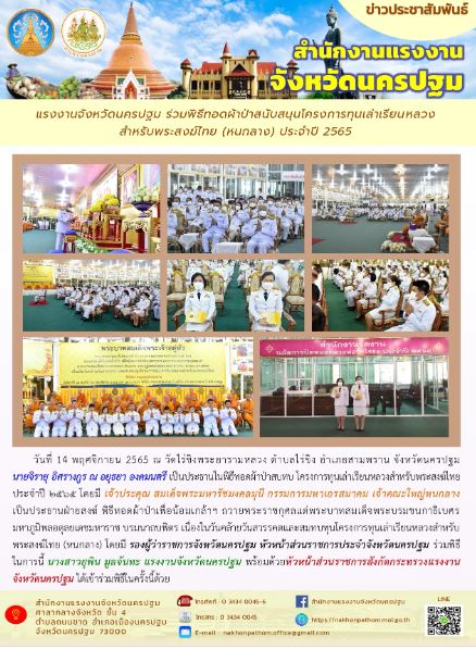แรงงานจังหวัดนครปฐม ร่วมพิธีทอดผ้าป่าสนับสนุนโครงการทุนเล่าเรียนหลวงสำหรับพระสงฆ์ไทย (หนกลาง) ประจำปี 2565