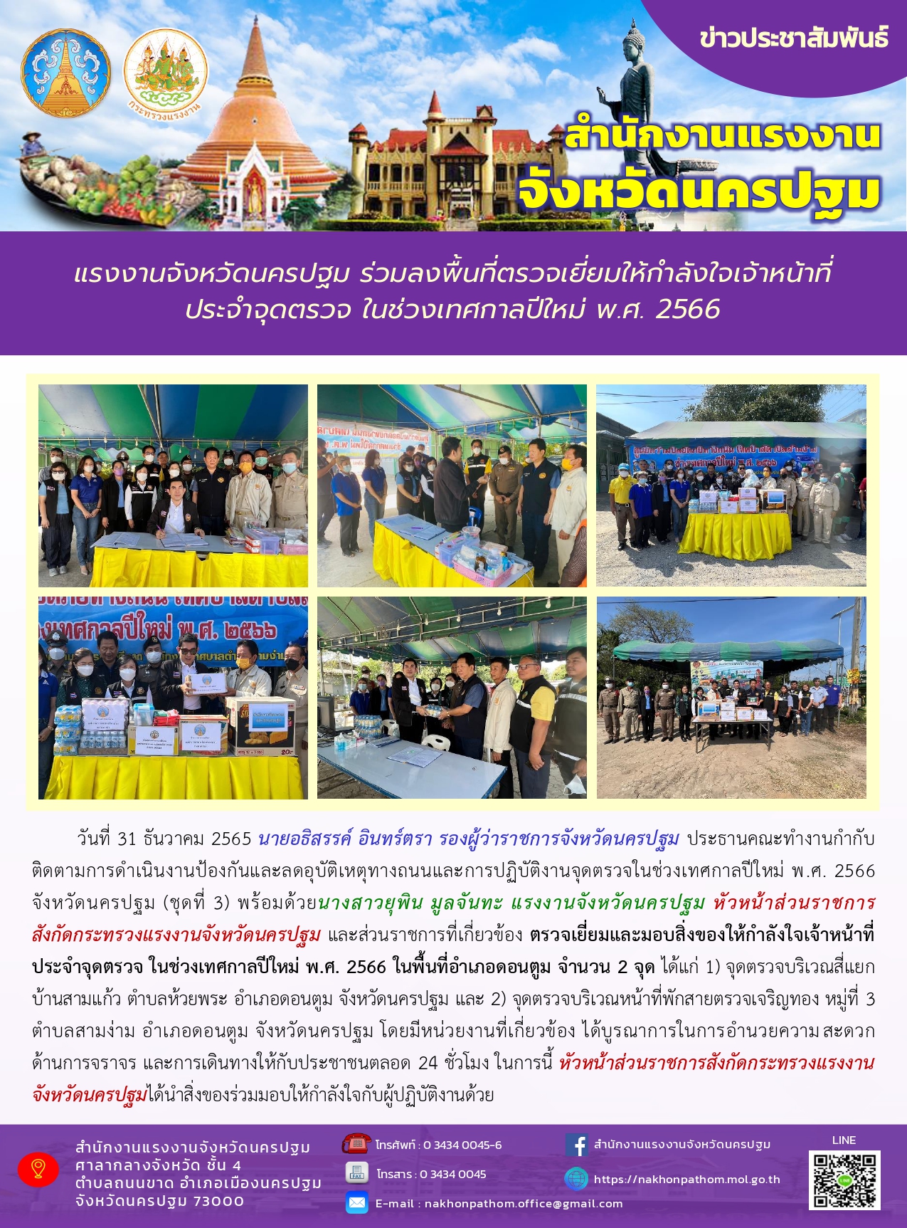 แรงงานจังหวัดนครปฐม ร่วมลงพื้นที่ตรวจเยี่ยมให้กำลังใจเจ้าหน้าที่ประจำจุดตรวจ ในช่วงเทศกาลปีใหม่ พ.ศ. 2566
