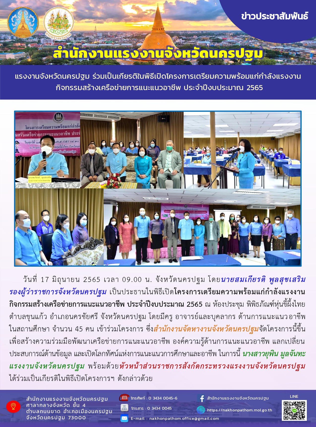 แรงงานจังหวัดนครปฐม ร่วมเป็นเกียรติในพิธีเปิดโครงการเตรียมความพร้อมแก่กำลังแรงงาน กิจกรรมสร้างเครือข่ายการแนะแนวอาชีพ ประจำปีงบประมาณ 2565