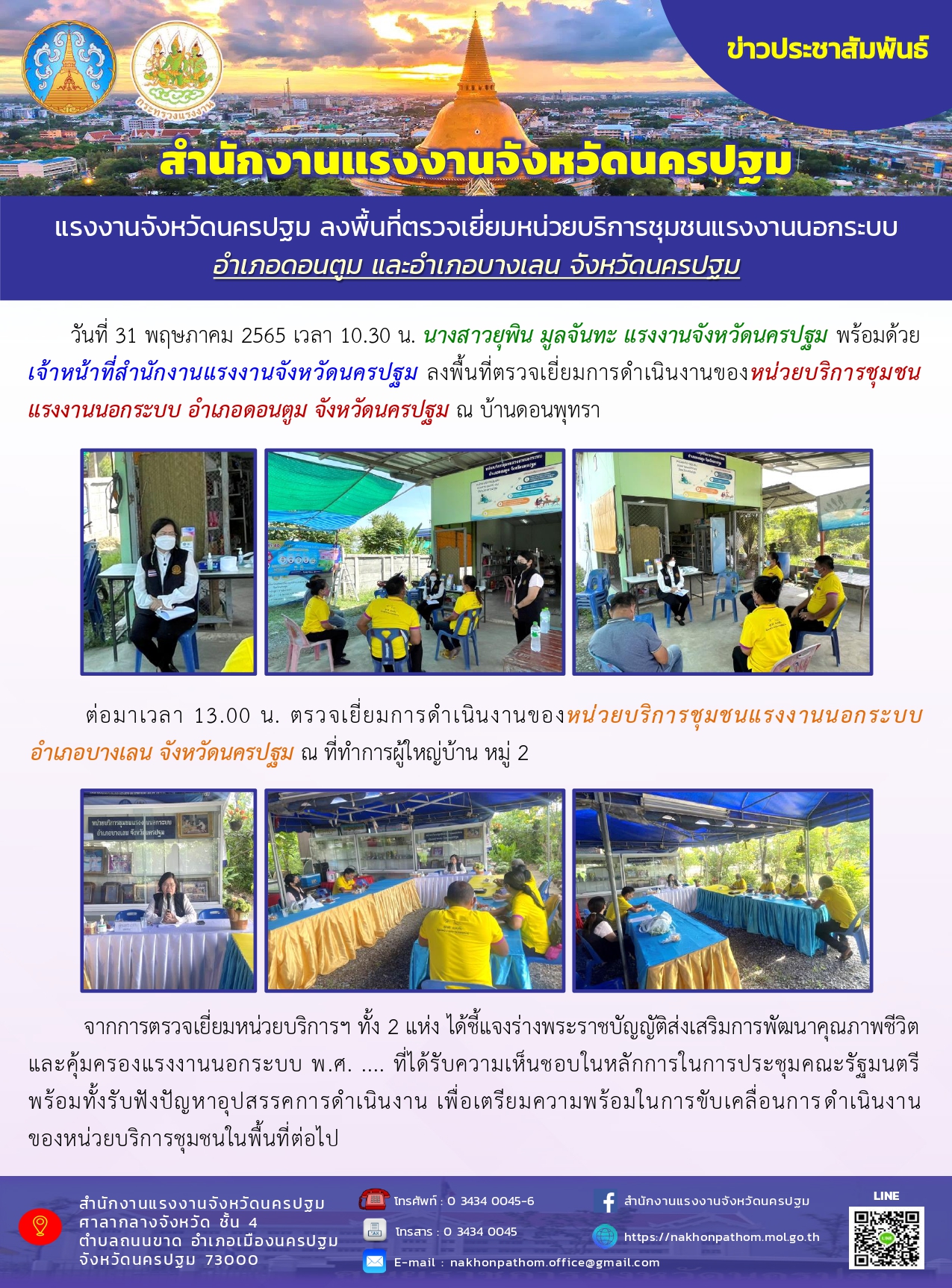 แรงงานจังหวัดนครปฐม ลงพื้นที่ตรวจเยี่ยมหน่วยบริการชุมชนแรงงานนอกระบบ อำเภอดอนตูม และอำเภอบางเลน จังหวัดนครปฐม