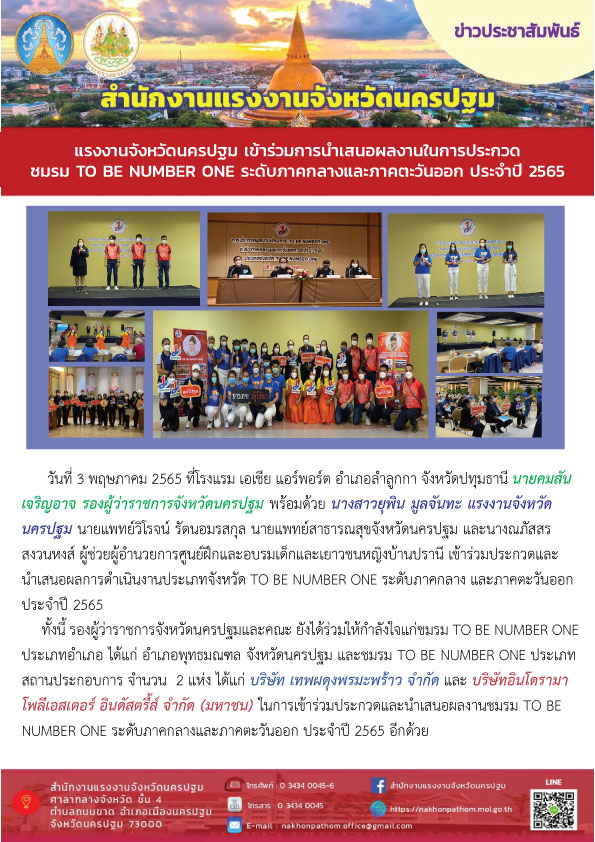 แรงงานจังหวัดนครปฐม เข้าร่วมการนำเสนอผลงานในการประกวดชมรม TO BE NUMBER ONE ระดับภาคกลางและภาคตะวันออก ประจำปี 2565