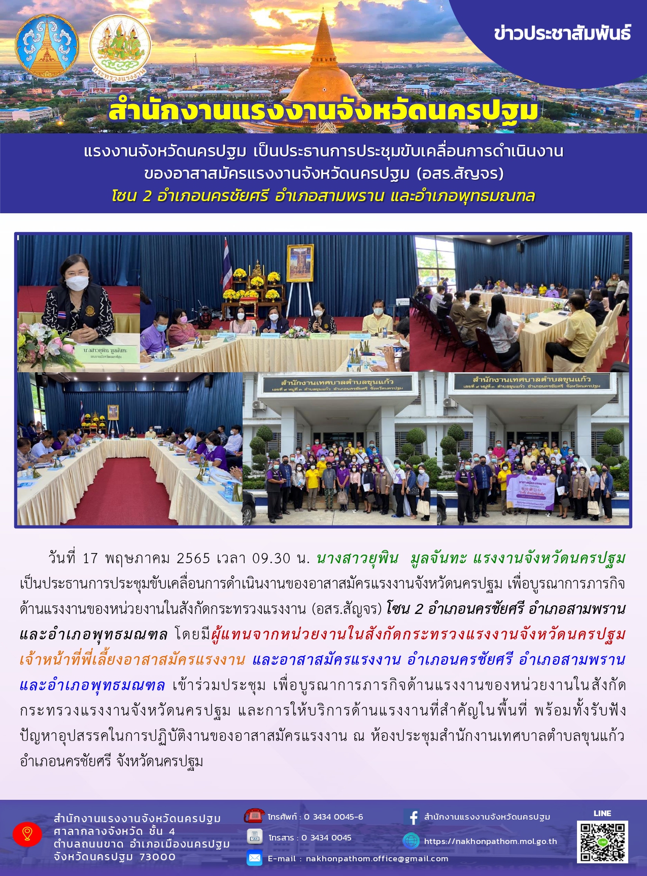 แรงงานจังหวัดนครปฐม เป็นประธานการประชุมขับเคลื่อนการดำเนินงานของอาสาสมัครแรงงานจังหวัดนครปฐม (อสร.สัญจร) โซน 2 อำเภอนครชัยศรี อำเภอสามพราน และอำเภอพุทธมณฑล